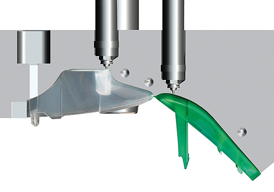 | Werkzeug: | Dreikomponenten-Werkzeug, In-Mould Assembly + Overmoulding Verfahren mit zwei rotierenden Indexplatten. Fertigung der Einzelkomponenten und Montage durch Umspritzen in einem Arbeitsgang |